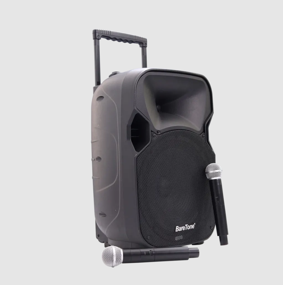 Sound yang mudah dibawa kemana mana. Dapat dihubungkan melalui bluetooth ataupun kabel. Kelengkapan sudah termasuk : 1 Speaker 12 Inch, 2 Mic Wireless, Kabel Olor, Kabel RCA, Kabel Power dan Baterai